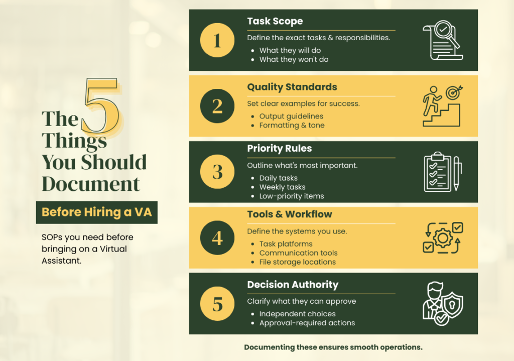 Without clear guidance, work turns into a constant back-and-forth conversation. The assistant keeps asking where to save files, which tasks matter first, or what format to use. None of these questions are unreasonable, but answering them all day removes the benefit of hiring help.